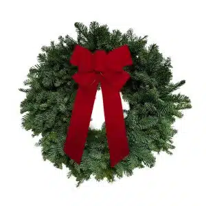 This Noble Fir Cross wreath is made from freshly cut Noble Fir and decorated with natural cones and a beautiful red velvet bow.